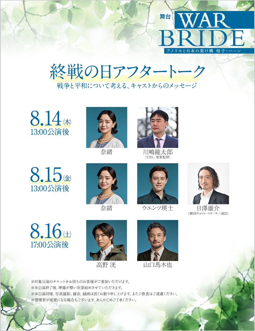 皆様にこの思いをお伝えする場を設けたく、8月15日の終戦の日と、その前後の公演で終演後、キャストからあらためて「平和」へのメッセージを伝えさせていただきます。